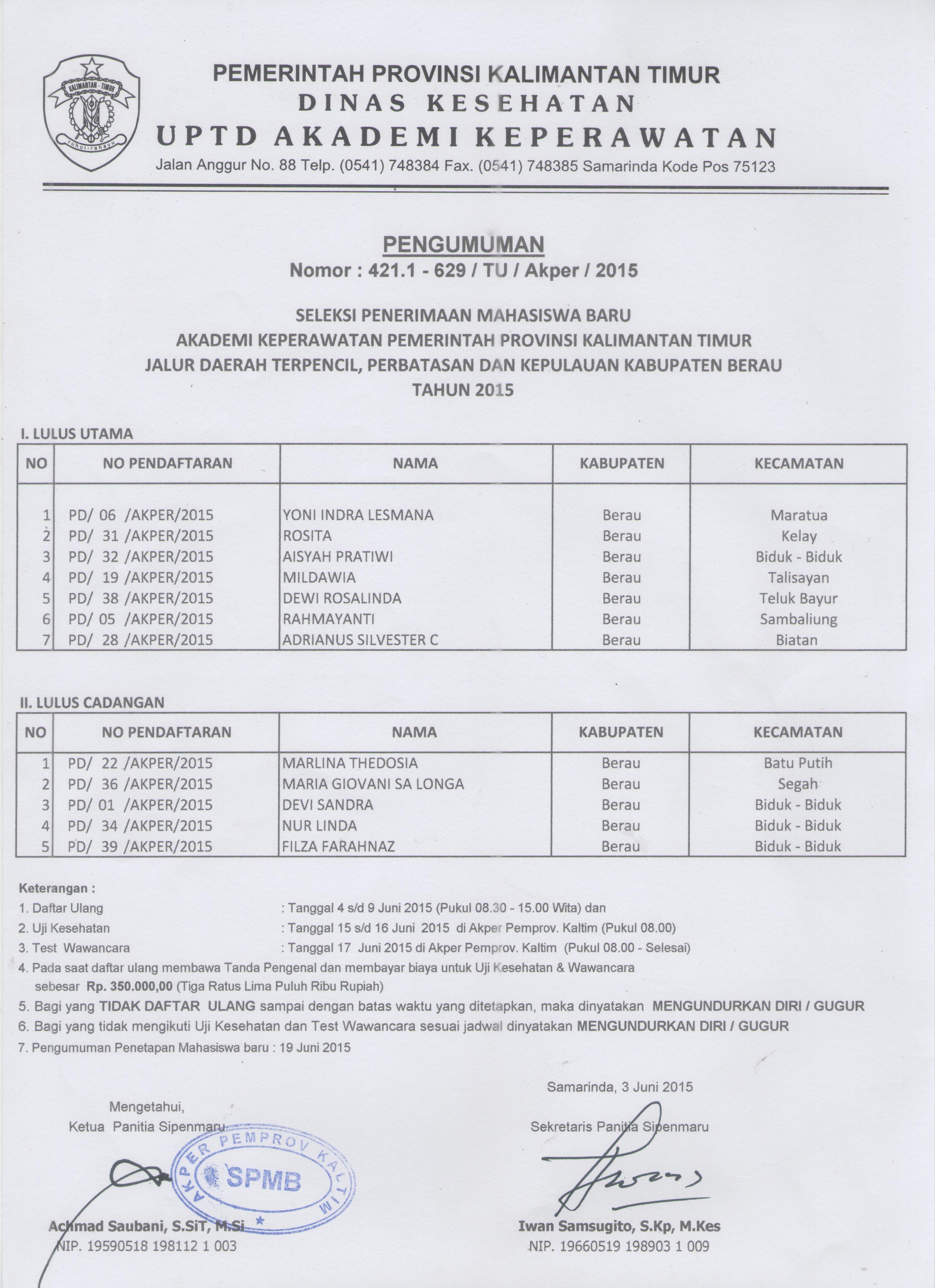 Halaman ini memuat hasil lulus uji berkas untuk jalur Daerah Terpencil, Perbatasan, dan Kepulauan (DTPK) Tahun Ajaran 2015/2016 pada penerimaan mahasiswa baru AKPER Pemprov Kaltim.